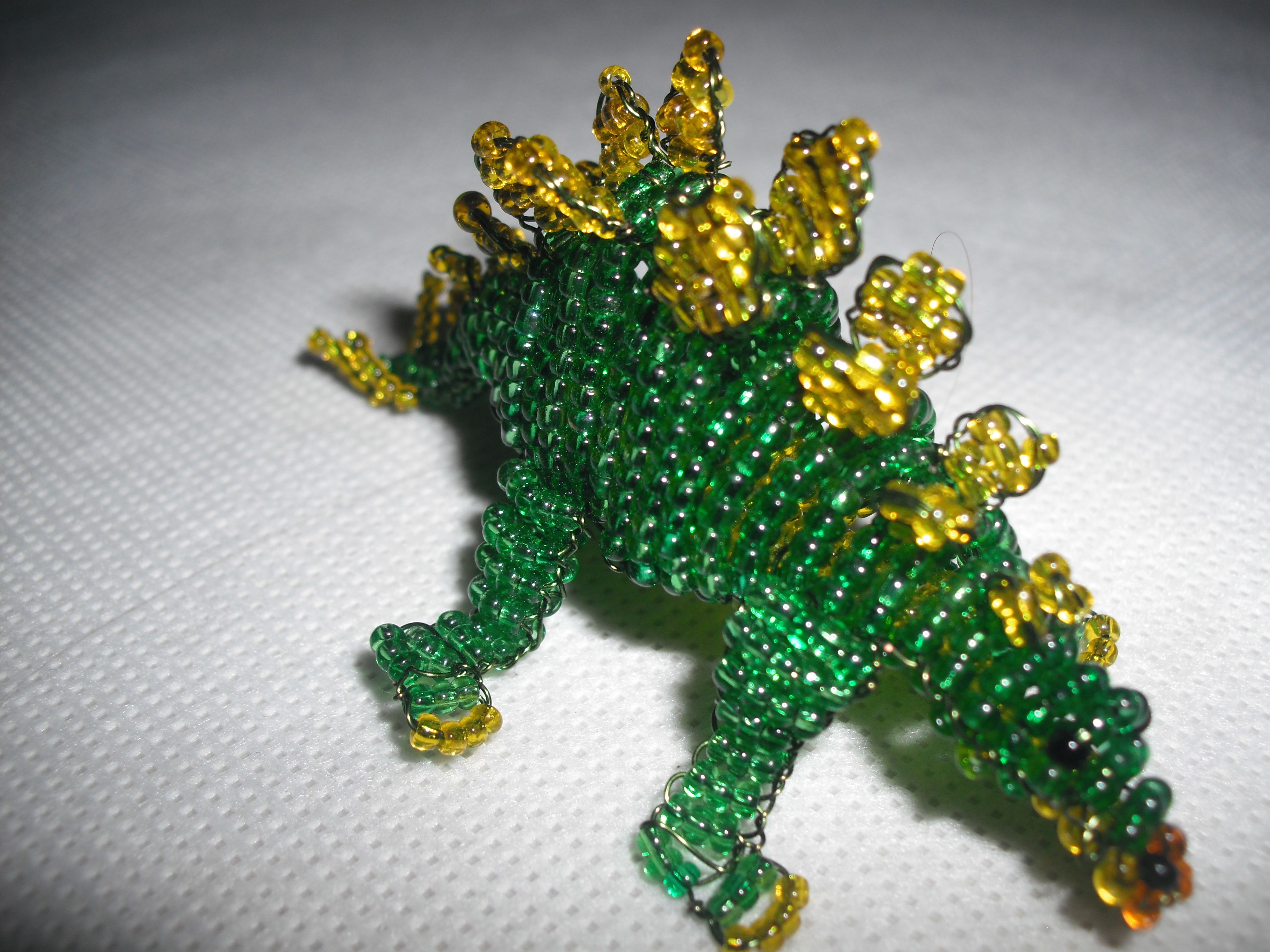 Le Stégosaure de profil et l'on peut apercevoir les plaques jaune de son dos.